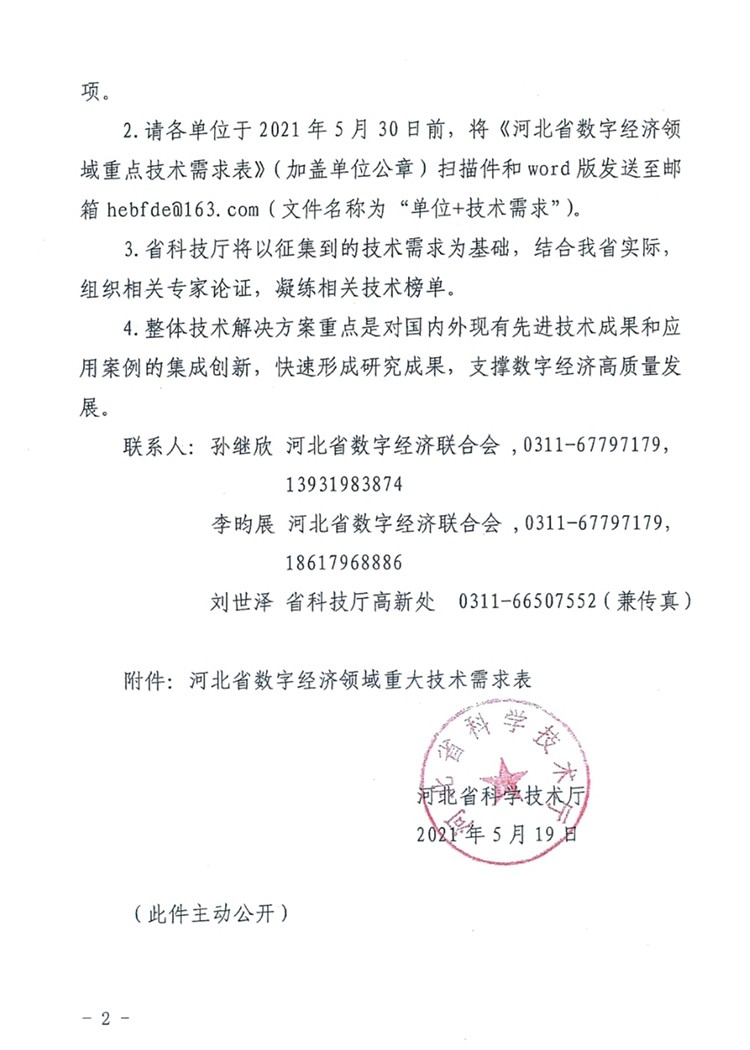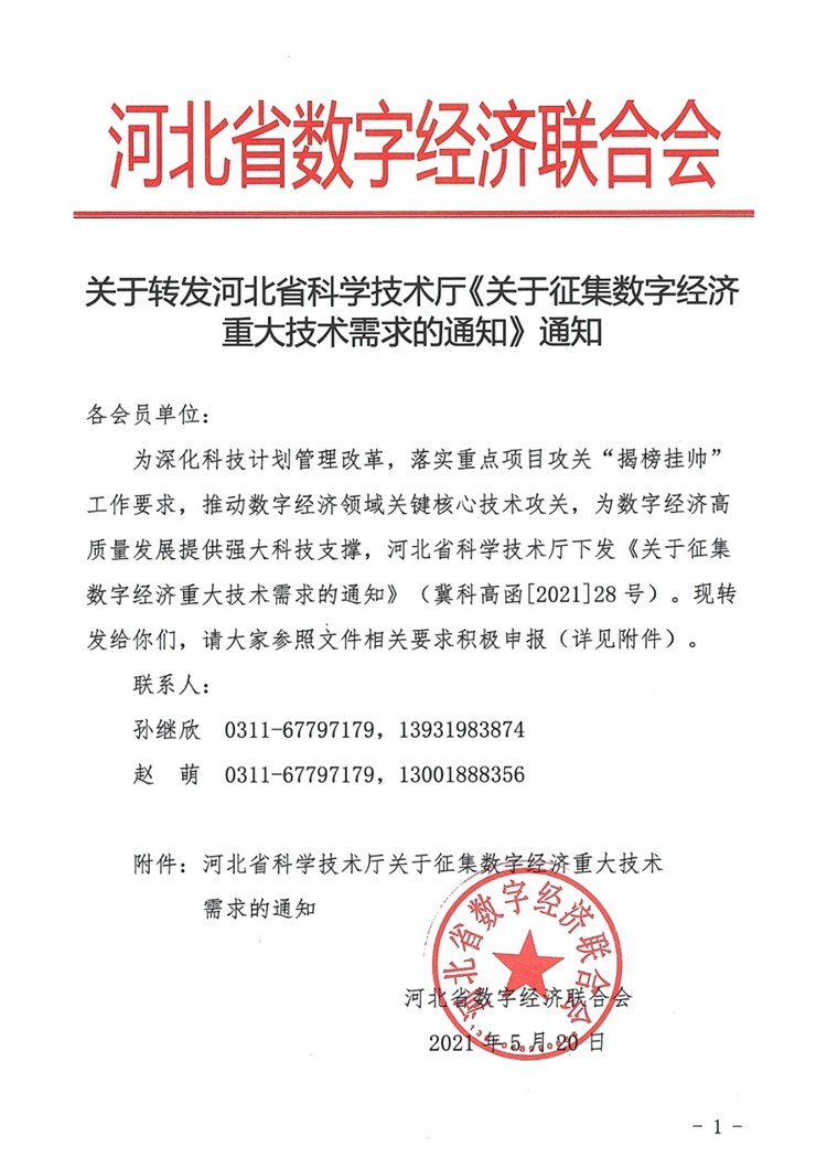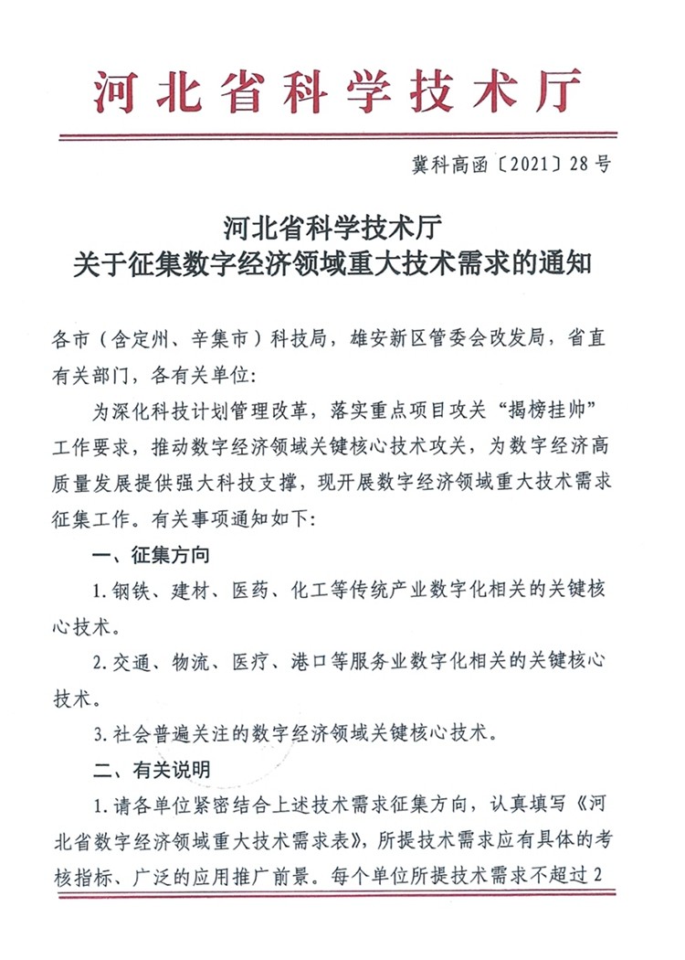 关于转发河北省科学技术厅《关于征集数字经济重大技术需求的通知》通知