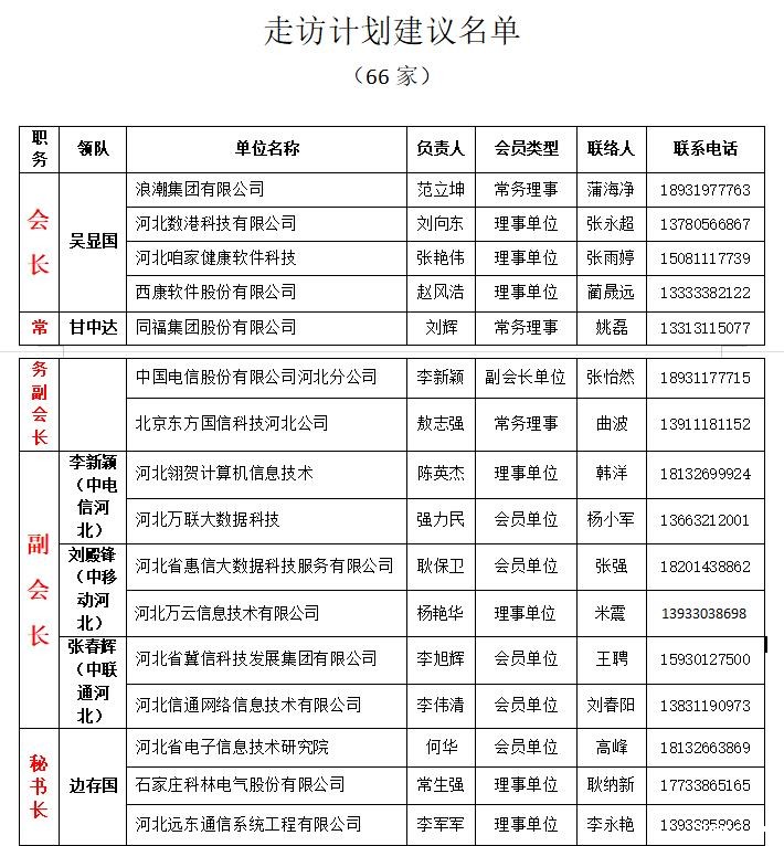 2、与走访企业深入开展交流互动,宣传联合会使命愿景价值观和工作部署。非驻会领导走访,由联合会配备工作人员陪同,倾听走访企业存在的问题,收集对联合会下一步工作的意见和建议。了解情况及时反馈至联合会电子邮箱:hebfde@163.com。